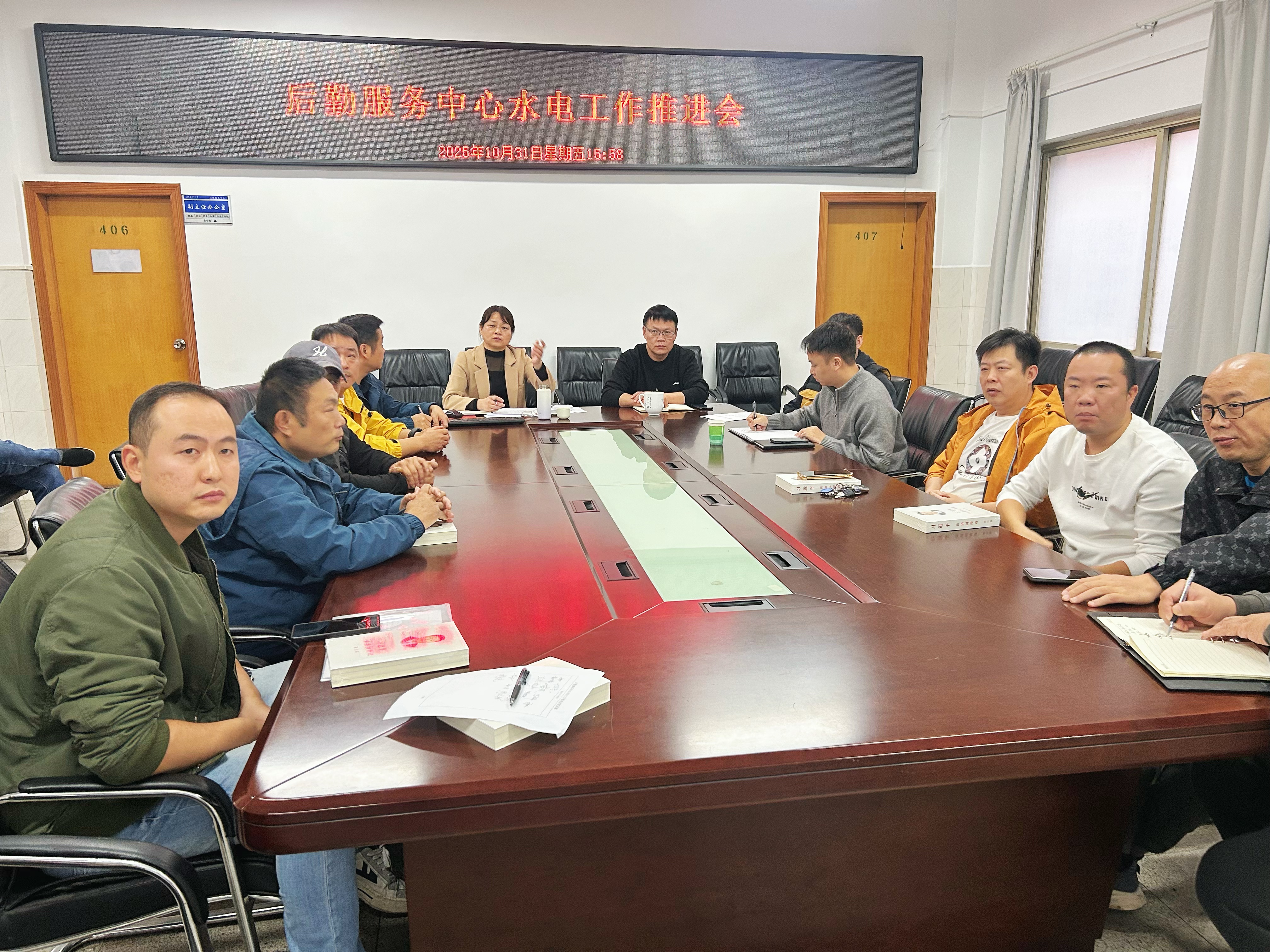 10月31日下午,后勤服务中心召开水电工作推进会,会议由后勤服务中心主任颜桂花主持,后勤服务中心副书记崔泽文及水电服务部相关人员参会。