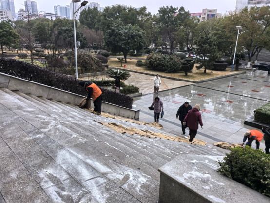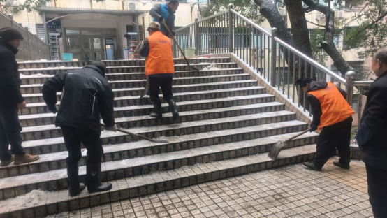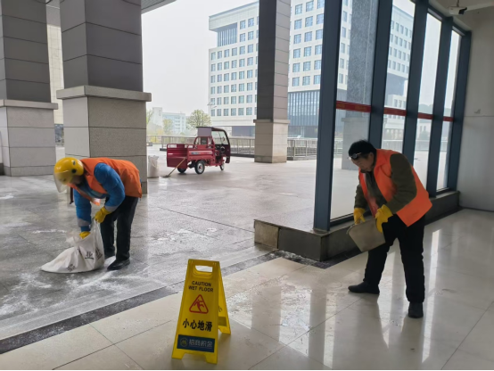 在后勤服务中心统一领导下,物业服务部组织管理骨干、保洁人员,按照“分片包干、先主后次”的原则,优先清理校园主干道、教学楼出入口、楼梯台阶等关键区域积雪,在教学楼、图书馆、学生宿舍出入口、食堂等人员密集场所出入口及陡坡、台阶等易滑区域铺设防滑麻袋,采用“人工清扫 + 融雪剂(工业盐)辅助”的方式高效除雪,确保道路畅通。